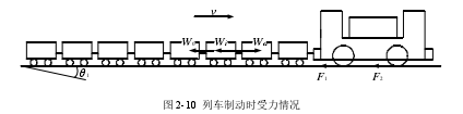 礦用電機車工作時牽引一組礦車在軌道上運行,其運動比較復(fù)雜,不僅是沿著軌道的縱向水平運動,還包括車體橫向的擺動、機車垂直方向上的跳動以及各個車體之間的相互撞擊引起的振動。然而,本文研究的是礦用電機車的制動特性,因此忽略制動時的其他運動,僅僅考慮沿著軌道水平運動,且礦車一般不帶制動裝置。在對礦用電機車整車制動狀態(tài)下進行動力分析時,將列車看成一個整體。列車制動時受力情況如圖 2-10 所示。